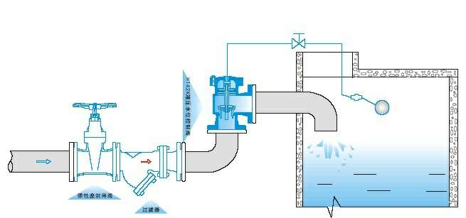 如此往复自动控制液面在设定高度,实现自动供水功能。该产品适用于工矿企业、民用建筑中各种水箱(池)、水塔的自动供水系统。并可用作常压锅炉循环供水控制阀。当水池或水塔内水位下降,浮球阀开启排水时,进水管内有压水将阀内活塞托起,密封面打开,阀门即开启供水,当水位上升到控制阀时,浮球阀关闭,活塞下移将密封面封闭,阀门即停止供水。